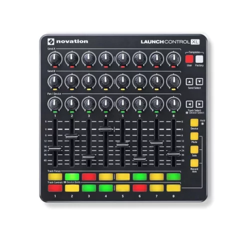 Controlador USB Launch Control XL, 24 knobs programáveis e 16 Launch pads retroiluminados em três cores e 8 faders 60mm.